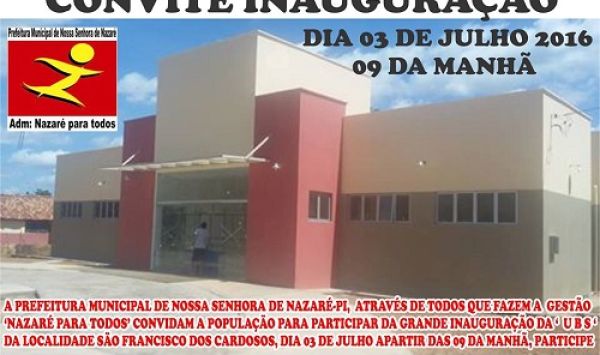 À administração Nazaré para Todos, Prefeito Zé Henrique, vem convidar toda a população para a inauguração da unidade básica de saúde, Luiz Cardoso da Silva, no Povoado São Francisco dos Ca