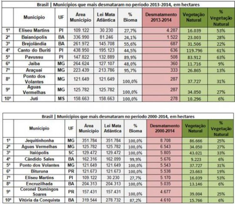De acordo com os dados mais recentes do Atlas, quatro dos 10 municípios que mais desmataram a Mata Atlântica no Brasil no período 2013-2014 ficam em Minas Gerais – Estado que liderou o ranking do desmatamento por 5 anos consecutivos e que agora passa a primeira posição para o Piauí, conforme divulgado em maio pela SOS Mata Atlântica e pelo INPE.No mesmo período, por outro lado, o Piauí abriga os dois municípios com maior conversação de Mata Atlântica no país, Tamboril do Piauí e Guaribas, ambos com 96% de vegetação natural – que inclui, além das florestas nativas, os refúgios, várzeas, campos de altitude, mangues, restingas e dunas.