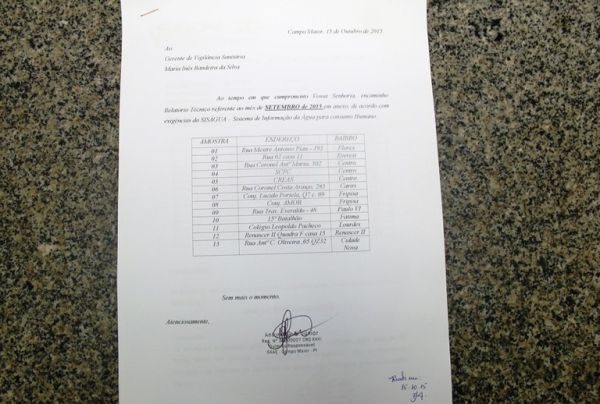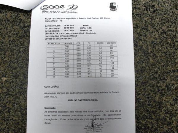 Dos 17 poços existentes na época, 04 deixaram de ser útil para o sistema de abastecimento e atualmente 13 poços operam na zona urbana da cidade. “Hoje 100% dos poços recebem tratamento e nosso químico realiza testes na água rotineiramente para identificar a potabilidade. A água distribuída é própria para o consumo humano porque nós tratamos”, explicou esclarecendo que se não houver tratamento, não é apropriado o consumo. Documentos abaixo mostram o teste feito pelo bioquímico Germano Junior comprovando a potabilidade da água de Campo Maior.