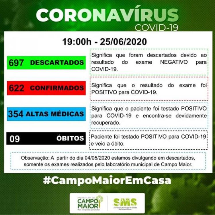 Segundo o boletim, nesta quinta-feira(25) a cidade Campo Maior conta com 622 casos confirmados, 697 descartados, 354 altas médicas e 09 óbitos.