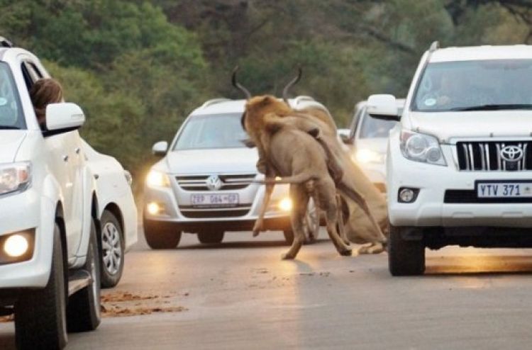 “O kudu (um tipo de antílope) pulou dos arbustos e os leões foram atrás dele no meio dos carros”, contou a mulher. Carolyn está completando um estágio no Parque Nacional Kruger, e dirigia pelo local durante a manhã quando presenciou a cena. O Kruger possui uma das maiores reservas de vida selvagem do continente.