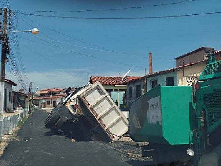 Uma carreta com carga de piche foi "engolida" por uma cratera depois que o asfalto cedeu na Rua 13 de Maio, no bairro São José, em Parnaíba, 337 km ao Norte de Teresina.