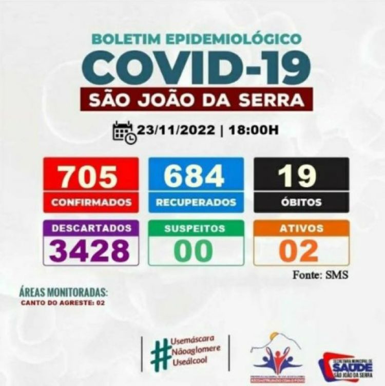 A Prefeitura de São João da Serra (PI) através da Secretaria de Saúde divulgou nesta quarta-feira (23) o retorno do boletim epidemiológico da covid-19. Após o retorno dos casos, a cidade contabiliza 2 ativos.