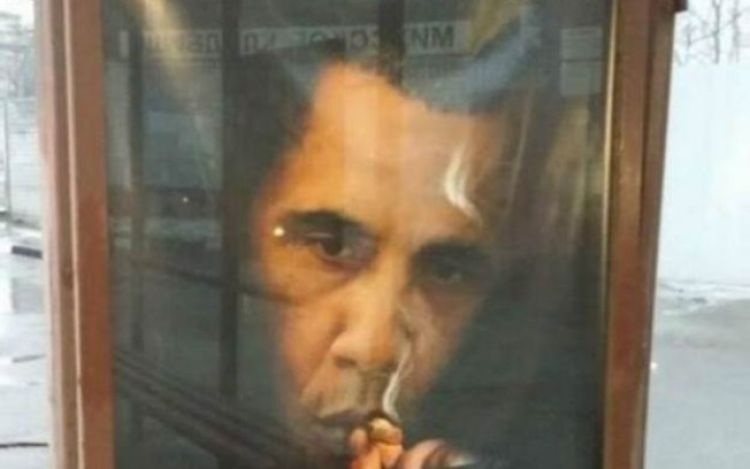 Uma imagem do presidente dos Estados Unidos, Barack Obama, com um cigarro na boca protagoniza um polêmico anúncio antitabaco em Moscou, na Rússia. "Fumar mata mais gente que Obama, e Obama já mata muita gente", diz a propaganda.