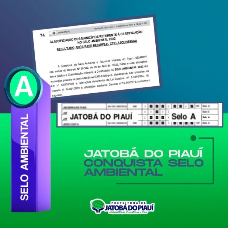 O município de Jatobá do Piauí conquistou o Selo Ambiental na categoria A do ICMS Ecológico 2021/2022, imposto que beneficia municípios que se destacam na proteção do meio ambiente. O resultado foi divulgado nesta quarta-feira (07) no Diário Oficial dos Municípios. O Selo A é a certificação mais alta conferida pelo Governo aos municípios.