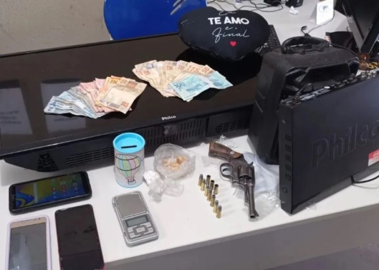 De acordo com a Polícia Militar, após tomar ciência de um furto praticado mediante arrombamento, as equipes seguiram em diligências e localizaram o autor do crime, onde com o mesmo foi encontrado os objetos furtados, um revólver calibre 32, munições e também uma certa quantidade de drogas, balança de precisão e dinheiro trocado.
