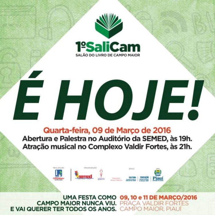 O 1° Salão do Livro de Campo Maior (SALICAM) começa nesta quarta-feira (09/03) e segue até sexta-feira (11/03) com uma vasta programação que inclui palestras, apresentações artísticas e culturais, homenagens, musicais e feiras de livros. Confira abaixo toda a programação:
