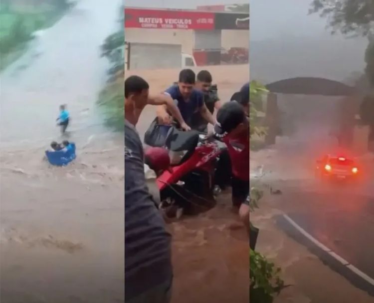 Na Rua 7 de Setembro, uma residência foi invadida pela água. No bairro Santa Fé, a força da enxurrada derrubou um muro, e no Centro, estabelecimentos comerciais foram atingidos, incluindo a agência da Caixa Econômica Federal. Vídeos gravados por moradores mostram motocicletas sendo arrastadas pela correnteza, enquanto populares tentavam resgatá-las.