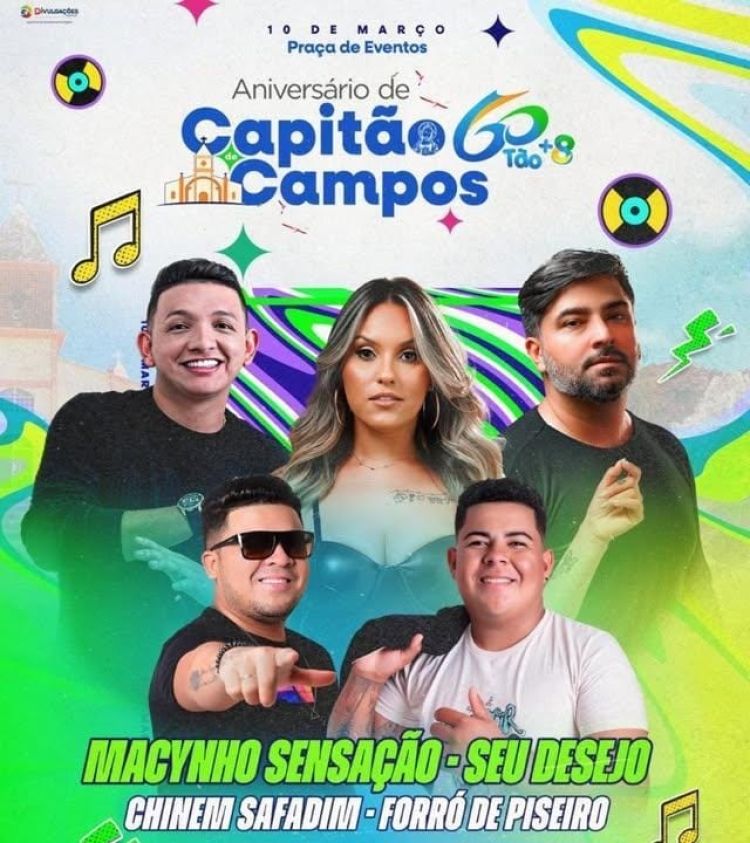 A cidade de Capitão de Campos comemora no dia 10 de março os seus 60 anos de emancipação política e com isso a prefeitura preparou uma baita programação com atrações imperdível.