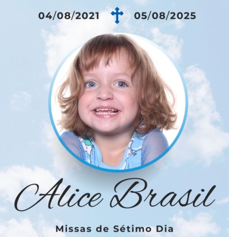 O Major Cláudio Sousa e sua esposa Daiana Brasil, convidam os familiares, amigos, professores, alunos, pais, filhos e a comunidade em geral, para em sufrágio da alma de sua amada filha Alice Brasil Rocha da Paz.