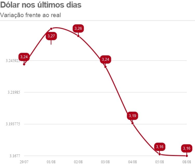 Na mínima do dia, a moeda norte-americana atingiu R$ 3,1599, segundo a Reuters. No mês de agosto, o dólar acumula queda de 2,31%. Em 2016, recua 19,7%.