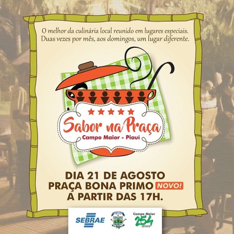No próximo domingo (21) a Prefeitura de Campo Maior em parceira com o Sebrae e empresários da cidade  realizam a 3° edição do projeto “Sabor na Praça” que acontecerá na Praça Bona Primo, a partir das 17:00 horas.