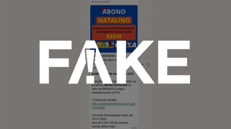 Circula no WhatsApp uma mensagem que usa símbolos da Caixa e do governo federal e promete pagamento de um "abono natalino". É #FAKE.