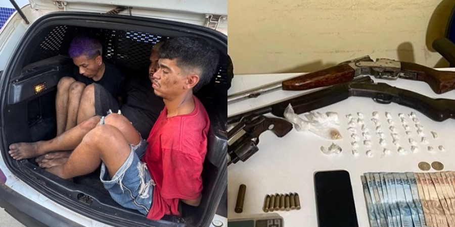 Durante a abordagem, os policiais apreenderam drogas, armas de fogo e outros materiais utilizados na atividade criminosa. Entre os itens apreendidos estão 40 porções de substância análoga a crack, uma porção de maconha, um revólver calibre 38 com seis munições, duas espingardas calibres 28 e 32, além de rádios comunicadores, balança de precisão, dinheiro em espécie e um aparelho celular.