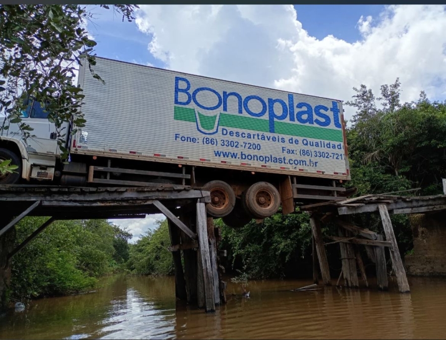 O caminhão de uma empresa de produtos descartáveis ficou preso quando tentava atravessar a ponte que fica na Comunidade Foge Homem, entre Campo Maior e Sigefredo Pacheco.