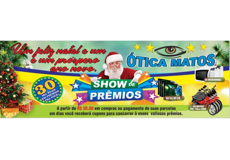 Ainda dá tempo você participar do mega sorteio da Ótica Matos e concorrer a 04 motos Honda 110cc Pop 0km, 04 TVs de LED e 04 de micro-ondas. São 30 mil reais em prêmios. O sorteio será no dia 14 de janeiro na loja matriz em Campo Maior.