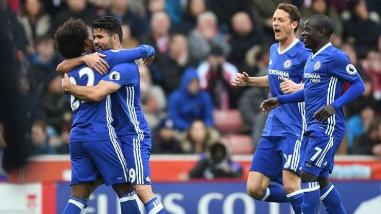 Se o técnico Antonio Conte calcula que serão necessários 24 pontos para ser campeão da Premier League, agora faltam 21. Jogando fora de casa, em partida válida pela 29ª rodada, o Chelsea empatava até os 41 minutos, mas foi buscar a vitória por 2 a 1 sobre o Stoke City e segue líder absoluto.