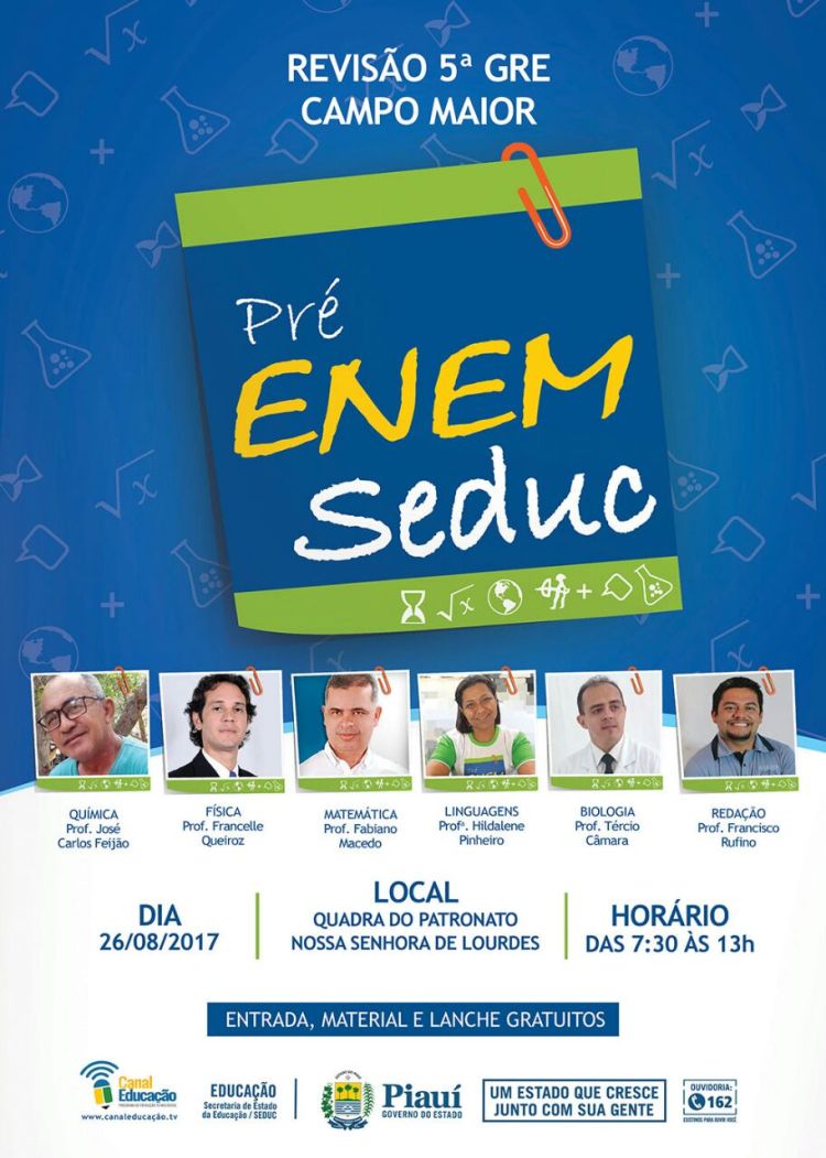 Sabendo da necessidade de estudo e atualização nos assuntos que remetem ao cotidiano global e nacional, a 5° Gerencia Regional de Educação, com sede em Campo Maior, promoverá neste sábado (26/08) o Pré-Enem Seduc onde professores renomados e com vasta experiência no exame auxiliarão os estudantes da região a sanar dúvidas rotineiras sobre o ENEM e matérias específicas.