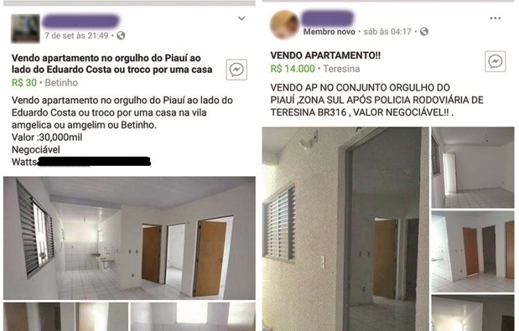 Todavia, é muito comum presenciar a venda desses imóveis em comunidades organizadas em redes sociais e a valores irrisórios. Em uma publicação no Facebook, o beneficiário oferece um apartamento no Residencial Orgulho do Piauí, localizado na zona Sul de Teresina, pelo valor de R$ 30 mil, podendo ser negociado.