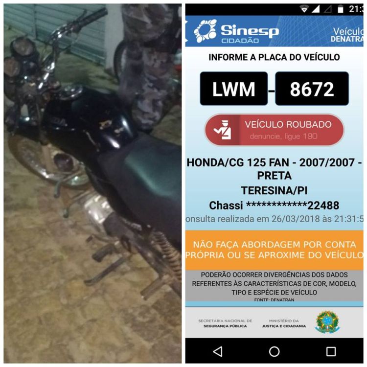 Segundo os policiais, a motocicleta modelo HONDA CG de placa LWM 8672 da cidade de Teresina estava em posse de uma mulher identificada como Francisca das Chagas de Sousa Carvalho.