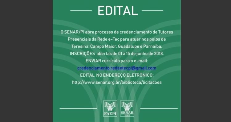 O Serviço Nacional de Aprendizagem Rural do Piauí (SENAR-PI) abriu inscrições para credenciamento de profissionais no desenvolvimento de Ações de Tutoria Presencial da Rede eTec para integrar o cadastro de Prestadores de Serviços do SENAR AR/PI, nos polos de Teresina, Campo Maior, Guadalupe e Parnaíba.