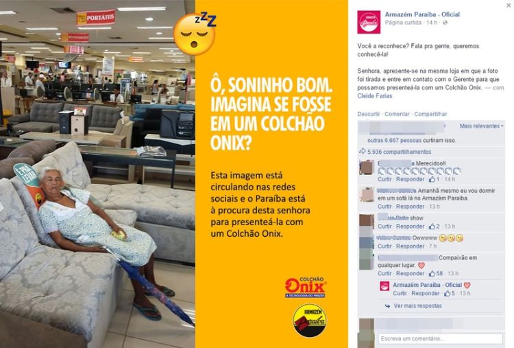 "Ô, soninho bom. Imagina se fosse em um colchão Onix? Esta imagem está circulando nas redes sociais e o Paraíba está à procura desta senhora para presenteá-la com um Colchão Onix", diz a postagem.