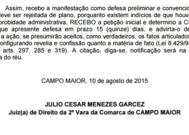 O juiz da 2ª vara da comarca de Campo Maior acatou a manifestação declarando que existem indícios de que houve, em tese, atos de improbidade administrativa praticada por João Félix