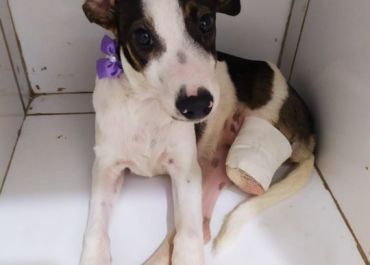 O animal está internado em uma clínica veterinária para tratar de uma infecção em uma pata. Menininha, depois de receber alta, será levada para a casa da sua futura dona.